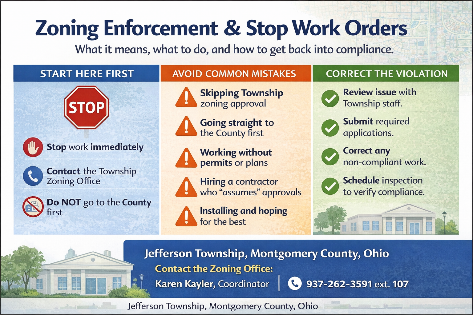 To avoid enforcement issues, residents should always start by contacting Jefferson Township before beginning any project, purchasing materials, or hiring contractors. Speaking with Township staff early helps ensure the correct permits are obtained, approvals are issued in the proper order, and projects move forward without unnecessary delays.