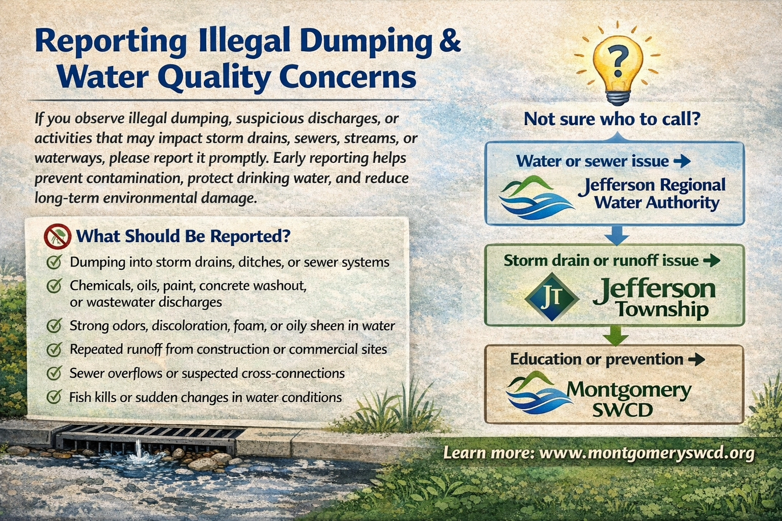 If you observe illegal dumping, suspicious discharges, or activities that may impact storm drains, sewers, streams, or waterways, please report it promptly. Early reporting helps prevent contamination, protect drinking water, and reduce long-term environmental damage.