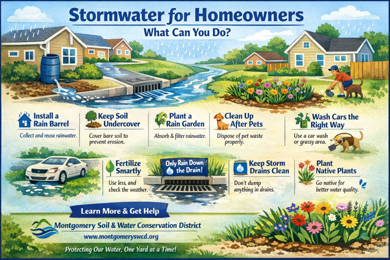 Most stormwater is not treated before it reaches our waterways, but homeowners play a powerful role in protecting water quality. Programs and resources from Montgomery Soil and Water Conservation District can help reduce runoff from your property—and many solutions are easy, affordable, and effective.