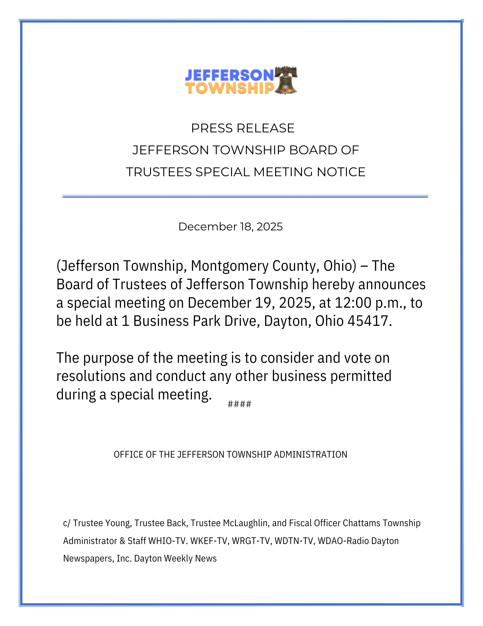 PRESS RELEASE JEFFERSON TOWNSHIP BOARD OF TRUSTEES SPECIAL MEETING NOTICE